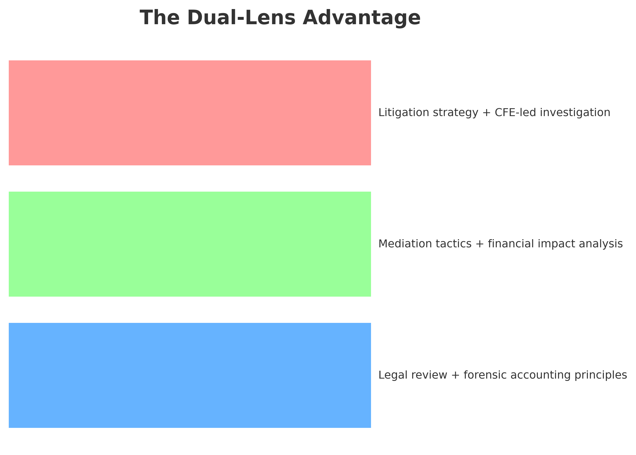 "Forensic accounting (CFE/CFrA credentials) applied solely in support of legal matters handled by this firm. Not offered as standalone services."